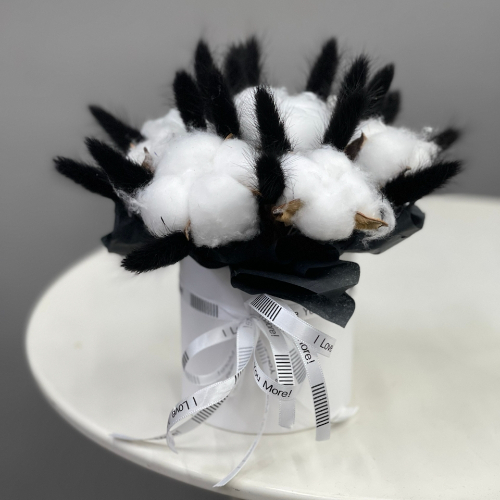 Композиция в шляпной коробке мини "Чикатуха" из хлопка и лагуруса